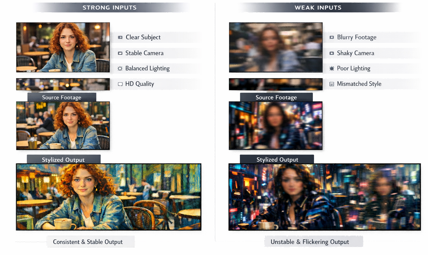 The best results usually come from strong inputs, not longer prompts. Use a video with one clear subject, balanced lighting, and moderate motion. If the camera is extremely shaky or the subject leaves the frame repeatedly, the stylization has to solve too many problems at once. The same goes for very compressed or low-resolution clips.