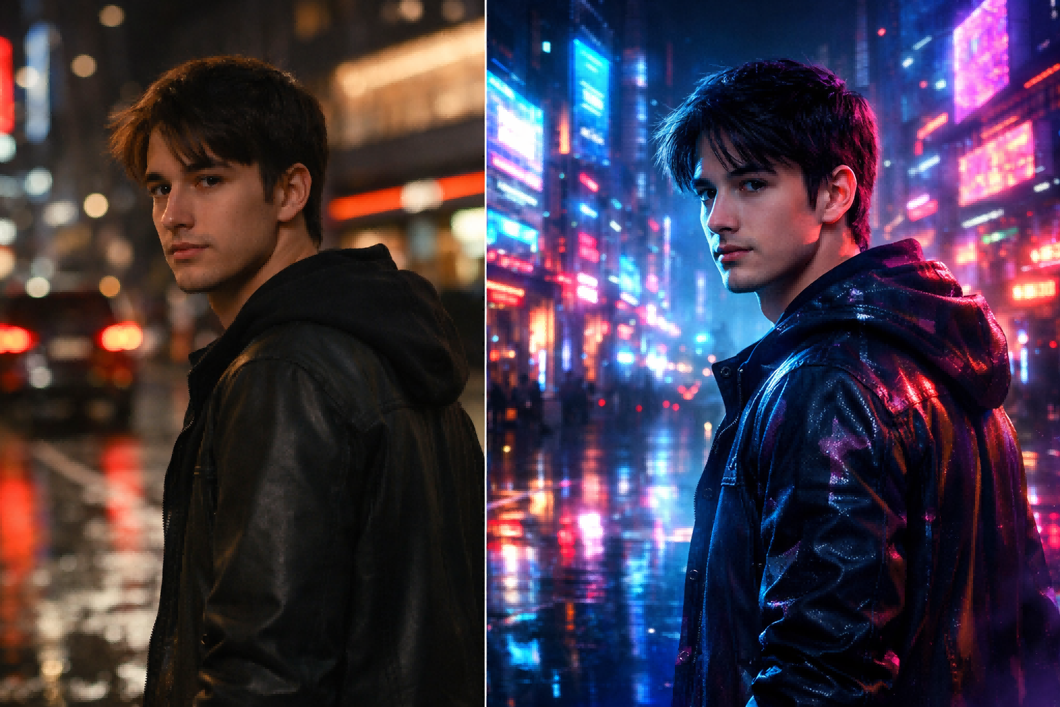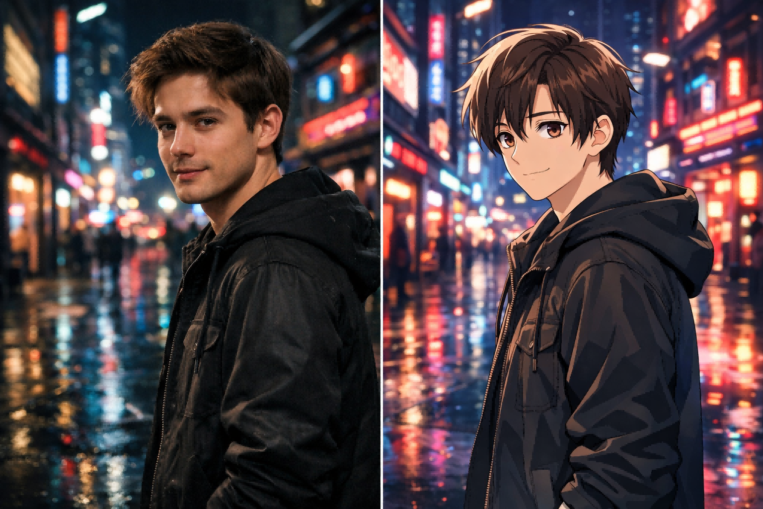 *Keep the subject’s original movement and camera rhythm. Restyle the scene into futuristic cyberpunk anime with neon reflections, holographic signage, electric blue and magenta lighting, atmospheric fog, glossy wet surfaces, sharp anime outlines, and cinematic city depth.*