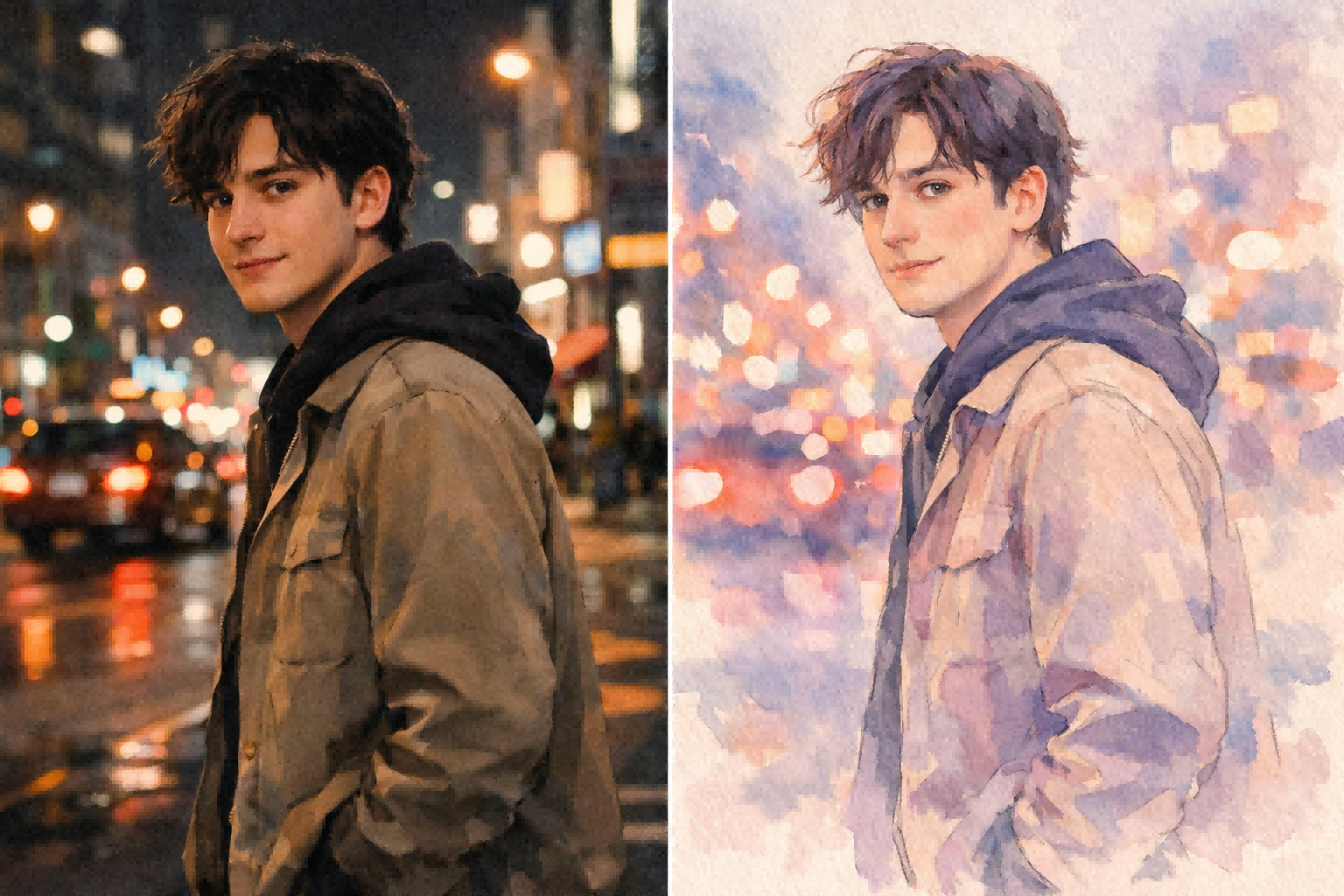 *Restyle the video into elegant watercolor illustration with soft brush textures, painterly edges, pastel tones, gentle contrast, dreamy lighting, and visually stable transitions across the clip.*
